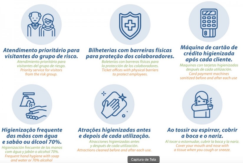 Nas duas entradas do Parque, localizadas na Estação Barra Sul e Estação Laranjeiras, terão sua temperatura aferida e não poderá entrar no complexo acima de 37,8gº todos os visitantes, colaboradores e lojistas também devem passar por um sistema de desinfecção por meio de um túnel de vapor de ozônio.