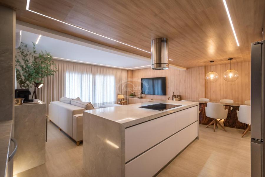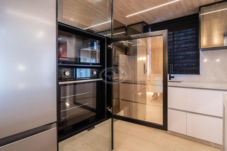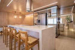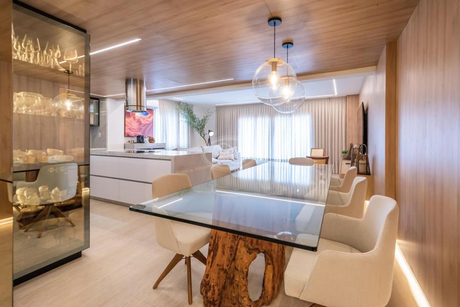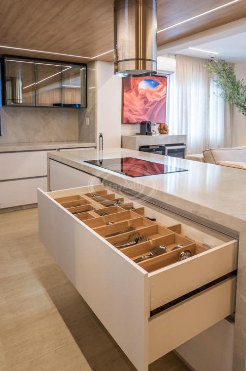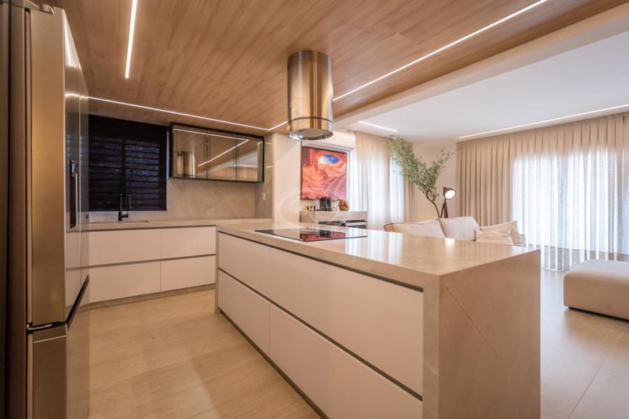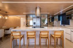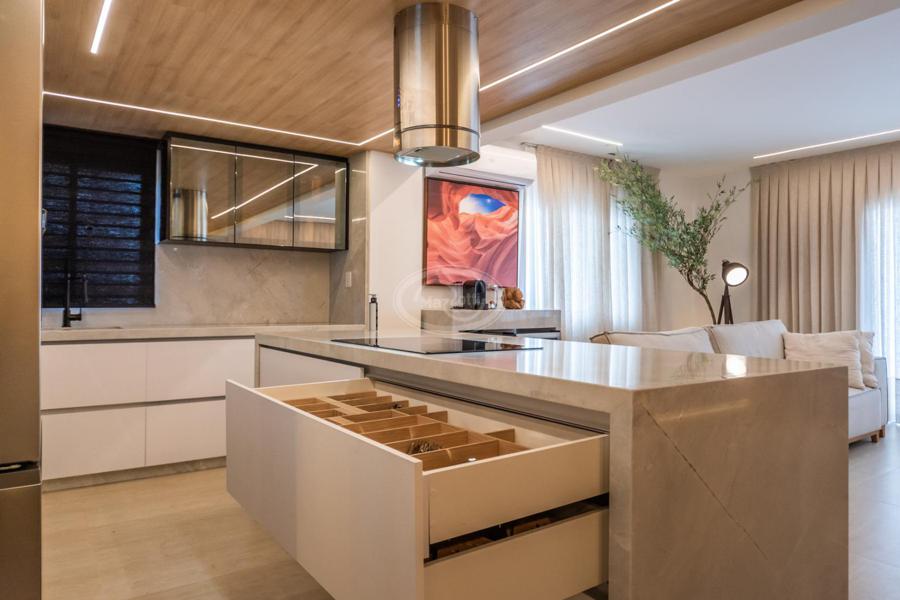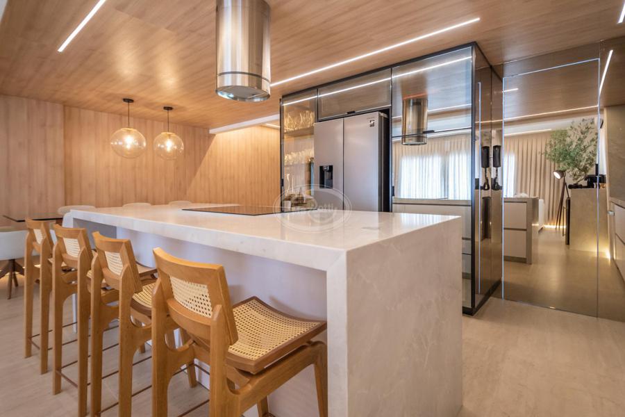 A cozinha, com uma vista deslumbrante para o mar, é integrada à área de estar e jantar, proporcionando um ambiente amplo e acolhedor para momentos de descontração e convivência. A luz natural inunda os espaços, criando uma atmosfera agradável e convidativa.