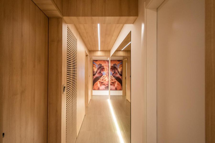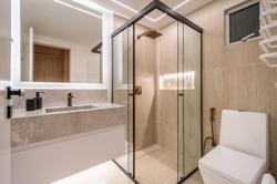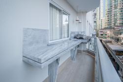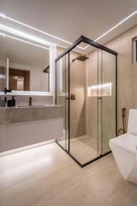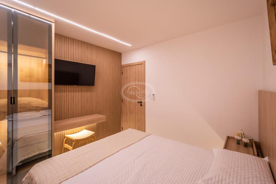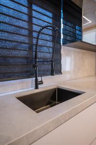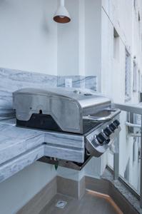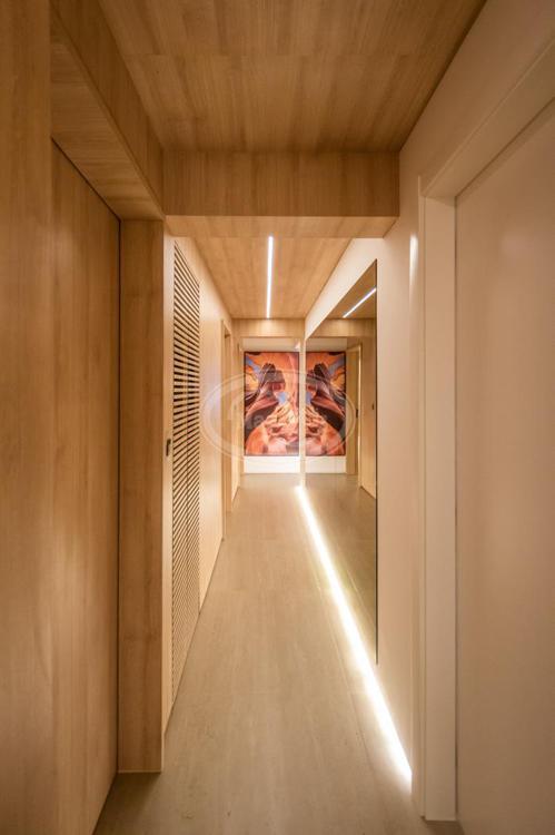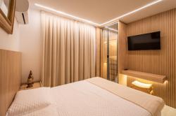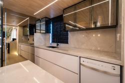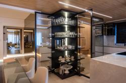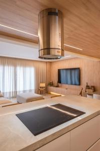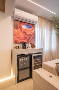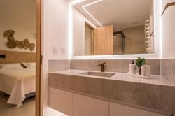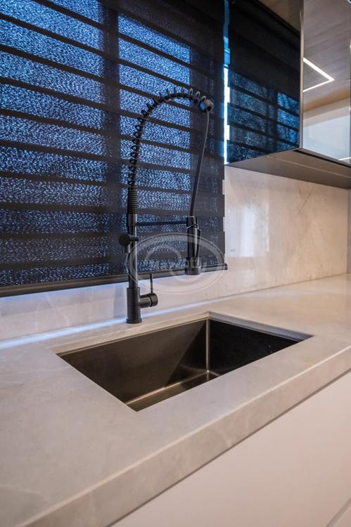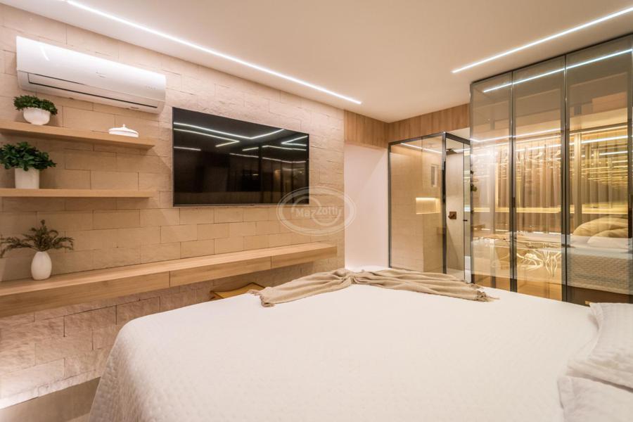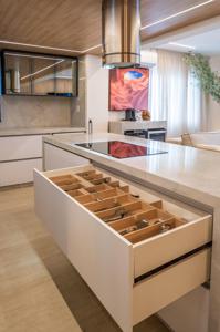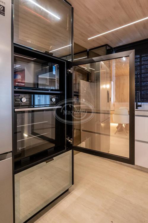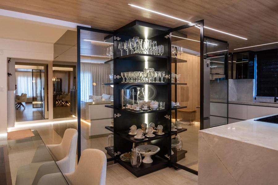 A cozinha, com uma vista deslumbrante para o mar, é integrada à área de estar e jantar, proporcionando um ambiente amplo e acolhedor para momentos de descontração e convivência. A luz natural inunda os espaços, criando uma atmosfera agradável e convidativa.