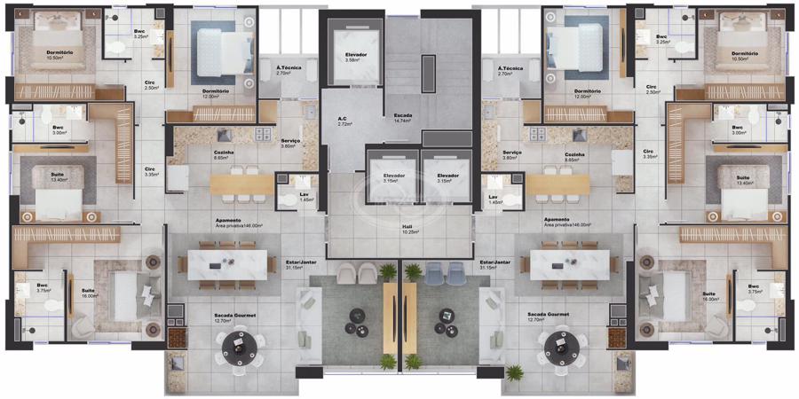 Os apartamentos deste empreendimento destacam-se por sua amplitude e aconchego, priorizando a privacidade e proporcionando espaços físicos generosos. A proposta é oferecer um padrão de vida elevado, atendendo às expectativas mais exigentes.