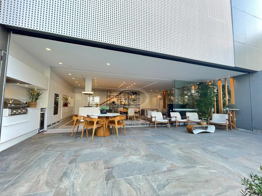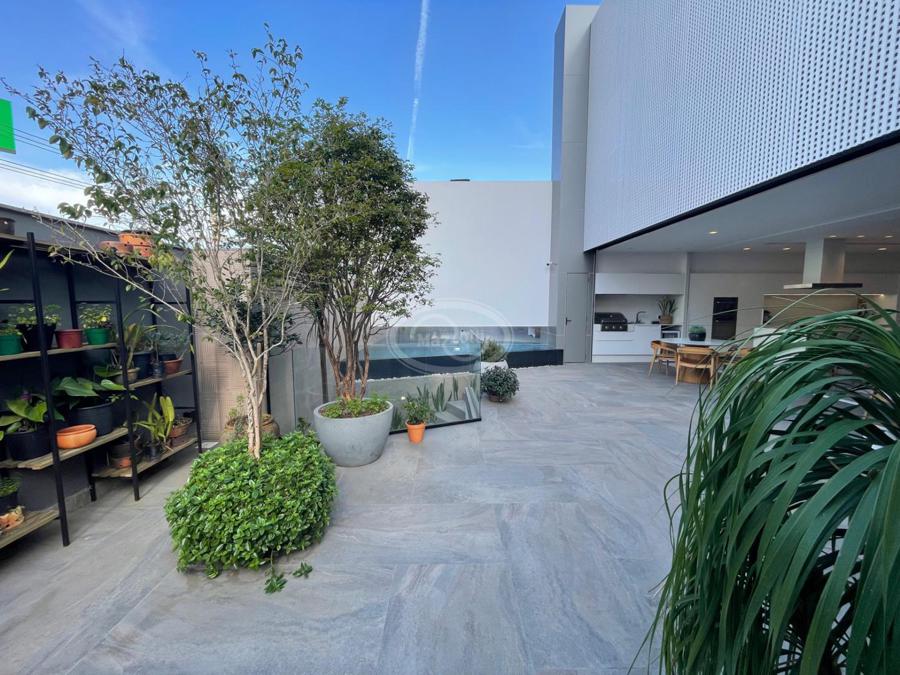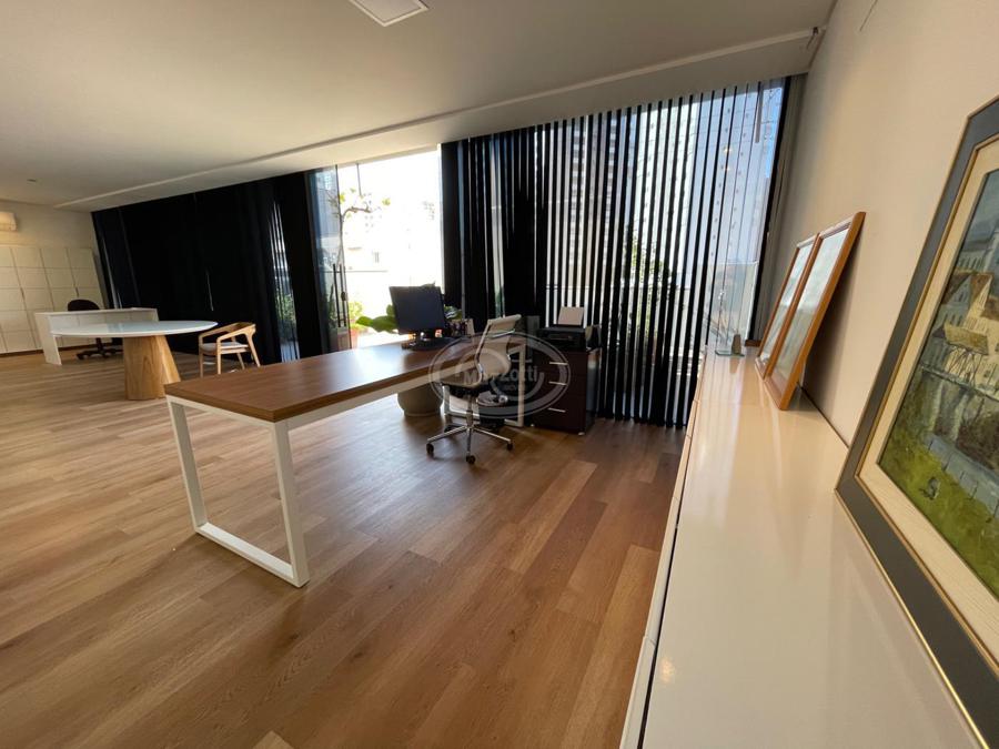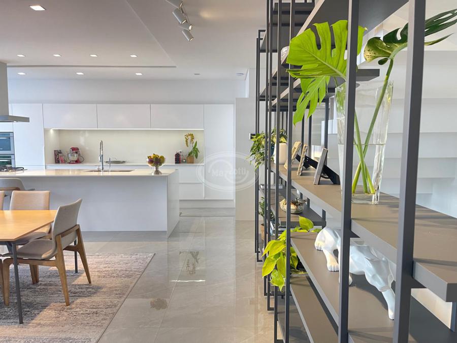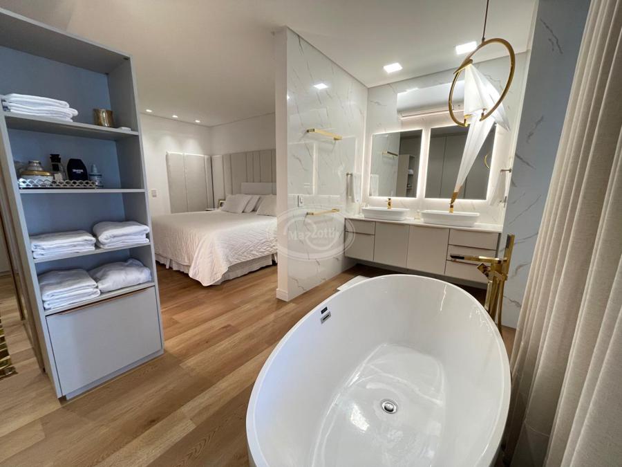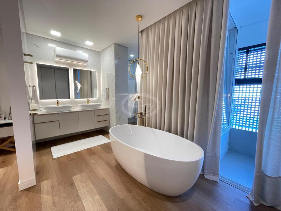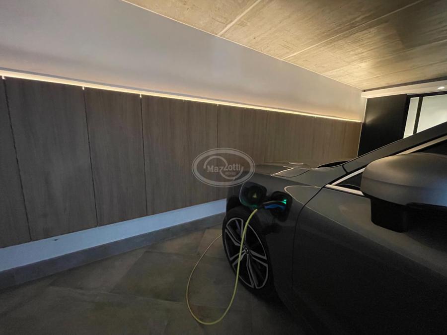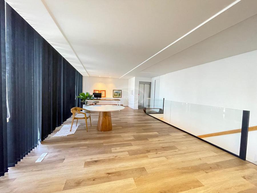 No Primeiro andar se encontra a garagem, com 7 vagas. Já no Segundo andar, possui um amplo living, sala c/ 2 ambientes, lavabo, cozinha americana, área externa com churrasqueira americana e lavanderia separada. As 3 suítes se encontram no terceiro andar, sendo uma delas Master, com banheira de imersão e closet com desumidificador nos armários e também há um depósito para malas. O quarto andar conta com um amplo escritório, com varanda externa, que pode ser facilmente transformado em mais uma suíte. A casa ainda conta com um diferencial: no primeiro e segundo andar, é possível acionar um portão eletrônico, que tranca a casa por completo, trazendo ainda mais segurança e conforto.